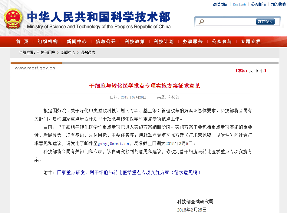 干細胞與轉化醫學重點專項實施方案征求意見 根據國務院《關于深化中央財政科技計劃(專項、基金等)管理改革的方案》總體要求,科技部將會同有關部門,啟動國家重點研發計劃“干細胞與轉化醫學”重點專項試點工作。 目前,“干細胞與轉化醫學”重點專項已進入…