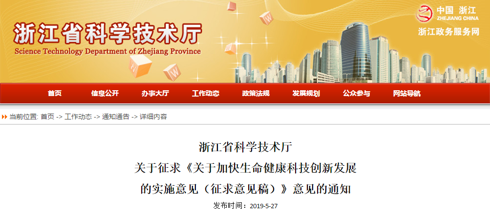 2019年5月27日,浙江省科學技術廳在其官網正式發布《關于加快生命健康科技創新發展的實施意見(征求意見稿)》,征求意見稿中提到:加強政策保障。在國際醫療旅游先行區、自貿區以及具有良好發展基礎的區域先行先試,科學穩妥地推進細胞治療技術創新發展試點。…